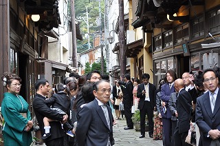 美保館から青石畳をゆく花嫁行列。神社前には突然横断幕とクラッカーの嵐!
